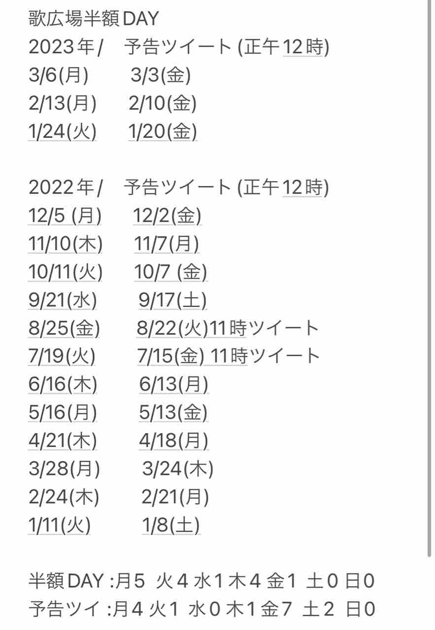 逆に金曜に半額デーが実施される事はほぼないようですね(翌日土曜なので夜は掻き入れ時となるからでしょうか)だいたい月火実施が多いようです。